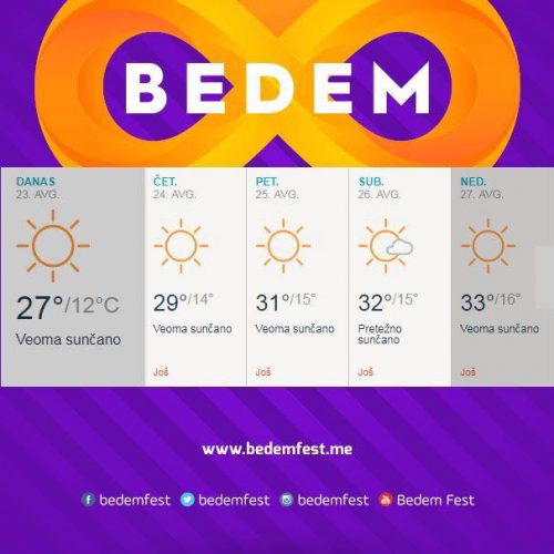 Bedem fest traje tri dana. Organizatori podsjećaju da je vremenska prognoza za te dane samo sunce, sunce i sunce. Karte će biti dostupne za prodaju tokom festivala na licu mjesta. Ulaznica za jedno veče je osam eura.