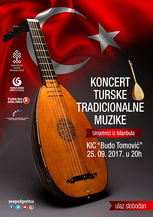 Institut Yunus Emre Podgorica uz podršku Ministarstva kulture i turizma Republike Turske, Turkish Airlines-a i u saradnji sa JU KIC ,,Budo Tomović’’ Podgorica organizuje koncert turske tradicionalne muzike. Na koncertu će nastupiti umjetnička grupa iz Istanbula.