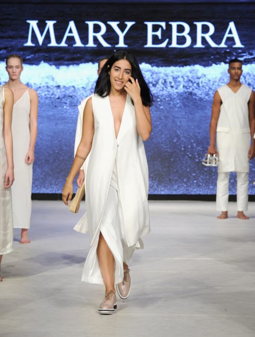 A uniform of white paraded down the runway to start Day five of Vancouver Fashion Week. Mary Ebra’s unisex collection of minimal cuts displayed developments and experiments of angles and straight lines. Metallic mirrored silver shoes carried in hand further denoted a modern style. A standout look was an almost-invisible sheer round-neck tee, paired with opaque wide leg pants. Translucent layers allowed a view of the interior construction with seams highlighted in white.