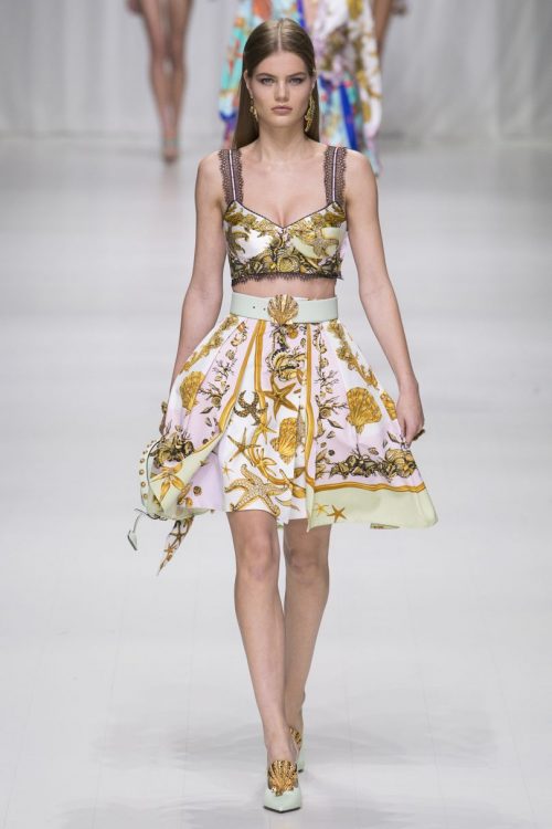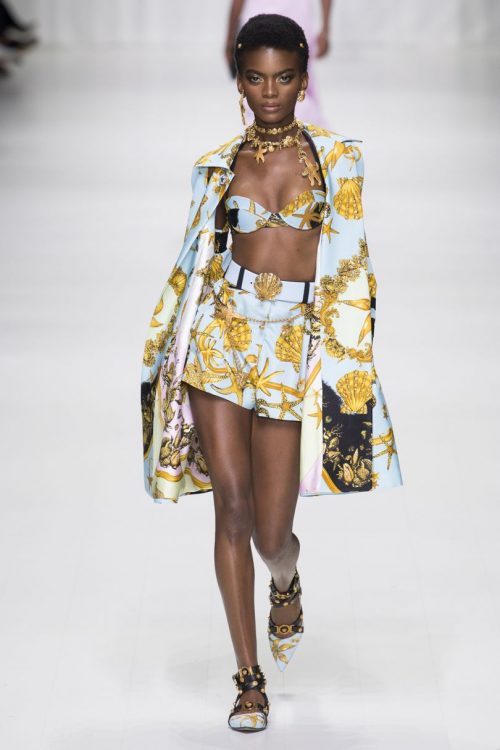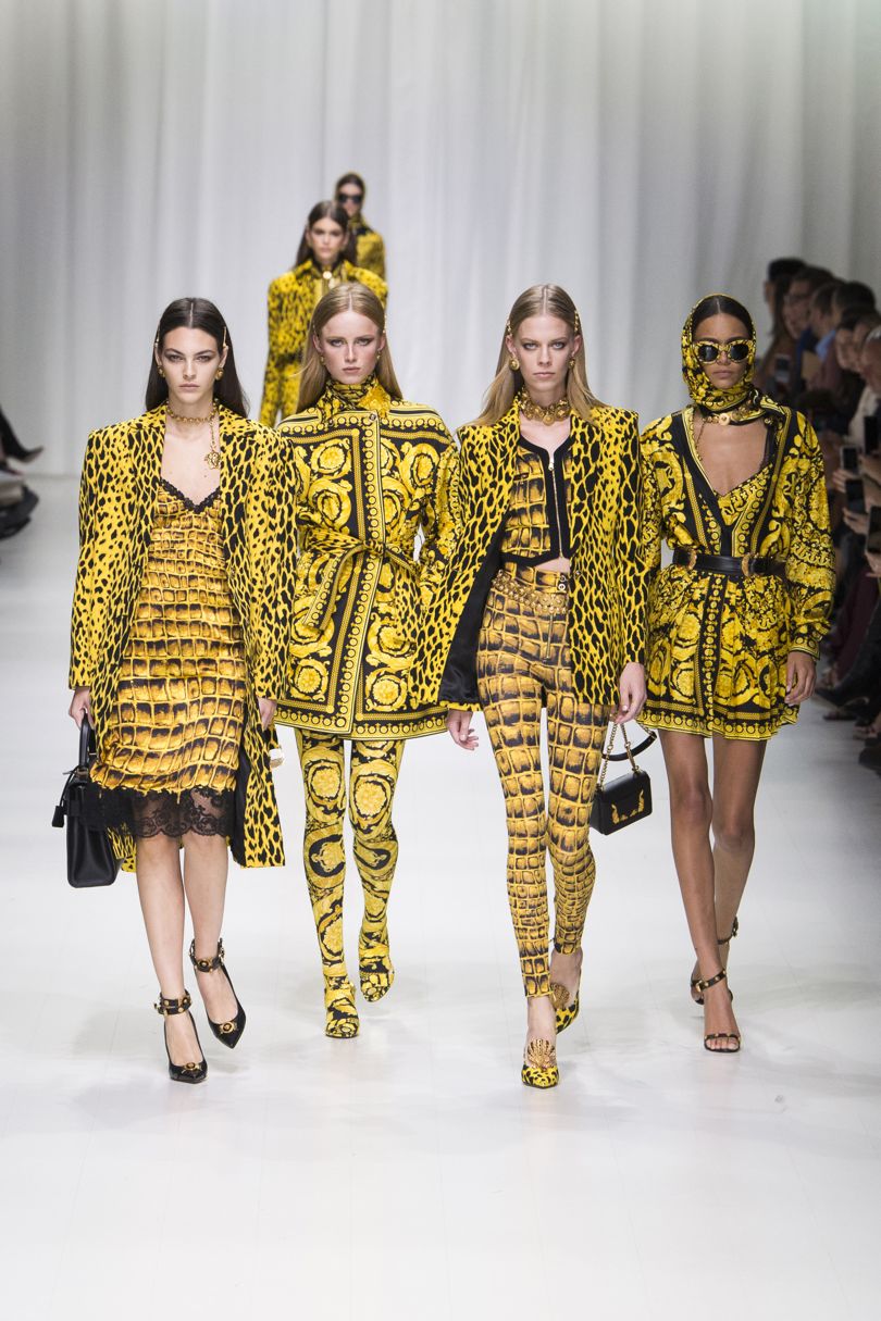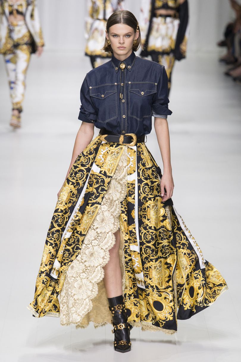 Tako je Donatela otvorila arhivu 1991-1995 i iz tih bratovih kolekcija ostavila Đanijevu formu ramena, džins sa visokim strukom, legings i zlatno-barokni print.