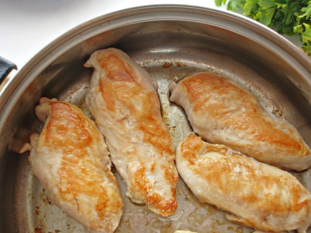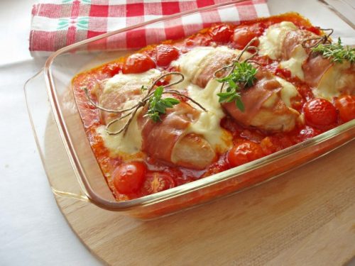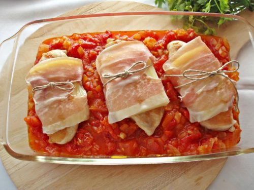 Sastojci: Dva pileća bijela mesa, četiri šnite šunke, četiri lista kačkavalja, 500 g paradajza, 1 crni luk, čen bijelog luka, dva lista lovora, ulje, so, biber u zrnu, bosiljak.
