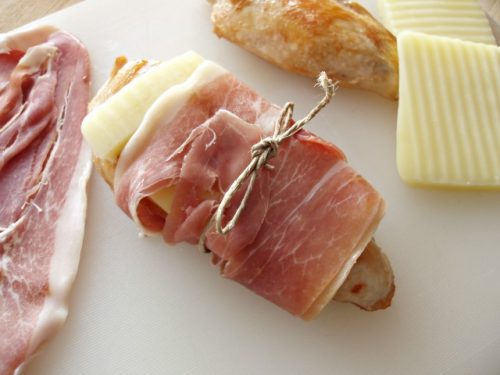 7. Izvaditi na tanjir da se malo prohladi, pa svako parče umotati u šnitu sira, a zatim list šunke. Sve dobro pričvrstiti kanapom.
