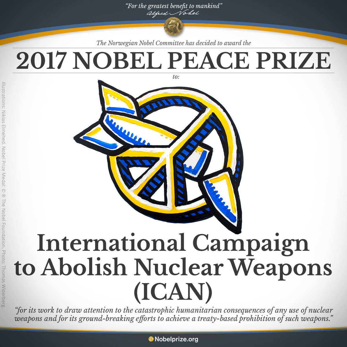 Dobitnik Nobelove nagrade za mir u 2017. godini je Međunarodna kampanja za zabranu atomskog oružja (ICAN) koja je podstakla usvajanje istorijskog sporazuma o zabrani atomskog oružja.