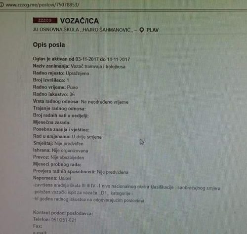 JU Osnovna škola “Hajro Šahmanović” iz Plava, raspisala je konkurs za vozača/vozačicu.