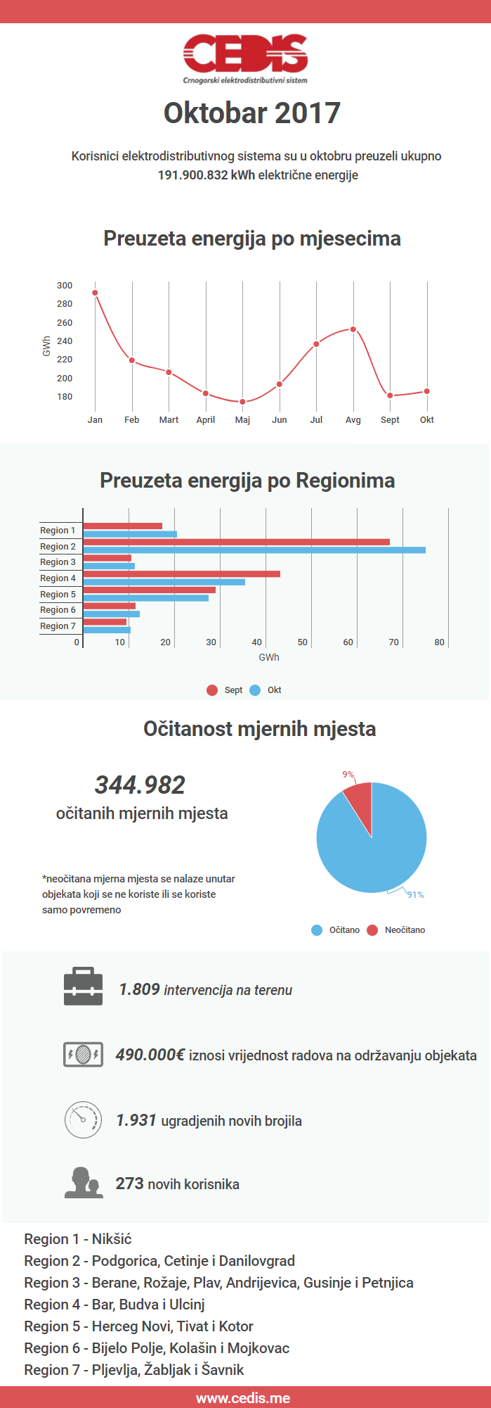 Tokom oktobra na području Crne Gore je ugrađeno 1.931 novih, elektronskih brojila. Ukupan broj mjernih mjesta u Crnoj Gori koja su opremljena elektronskim brojilima na daljinsko upravljanje je oko 266 hiljada, čime je pokriveno oko 70 odsto konzuma.
