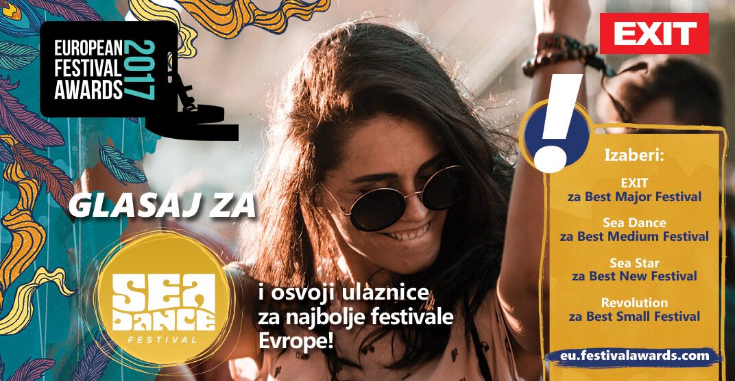 Glasanje za Evropske festivalske nagrade trajaće još svega tri dana, do 30. novembra, a EXIT i njegova tri regionalna festivala Ljeta ljubavi osvojili su ove godine čak pet nominacija. Naš Sea Dance se za titulu najboljeg festivala do 40.000 posjetilaca dnevno, takmiči sa festivalima kao što su Balaton, Melt!, Pohoda, Extrema Outdoor, INmusic ili Repeerbahn.