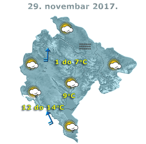 Ponegdje su moguće umjerene do obilne količine padavina. Vjetar će biti južnih smjerova, tokom dana povremeno umjeren do jak, krajem dana i tokom noći pojačan i jak, na udare olujne jačine.