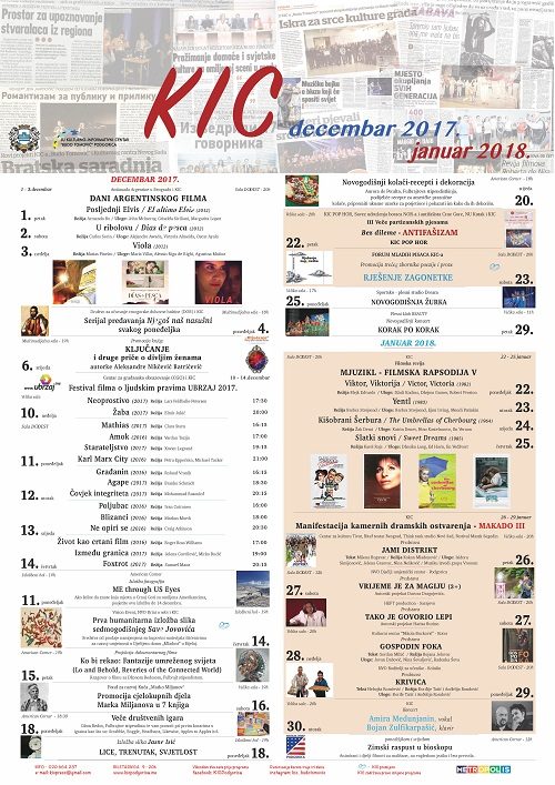 Ulaz je besplatan za većinu decembarsko/januarskih programa u KIC-u, a od petka (1.decembra) na biletarnici se mogu preuzeti besplatne karte za treće veče partizanskih pjesama KIC POP HORA pod nazivom BEZ DILEME – ANTIFAŠIZAM.