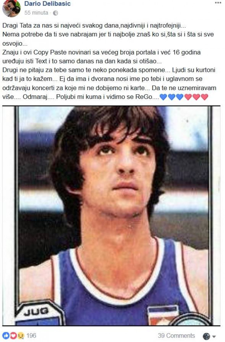 – Dragi Tata, za nas si najveći svakog dana, najdivniji i najtrofejniji… Nema potrebe da ti sve nabrajam jer ti najbolje znaš ko si, šta si i šta si sve osvojio… Znaju i ovi Copy Paste novinari sa većeg broja portala i već 16 godina uređuju isti tekst i to samo danas na dan kada si otišao… Drugi ne pitaju za tebe, samo te neko ponekada spomene… Ljudi su kurtoni kad ti ja to kažem… Ej da, ima i dvorana, nosi ime po tebi i uglavnom se održavaju koncerti za koje mi ne dobijemo ni karte… Da te ne uznemiravam više…. Odmaraj…. Poljubi mi kuma i vidimo se ReGo – napisao je Dario Delibašić.
