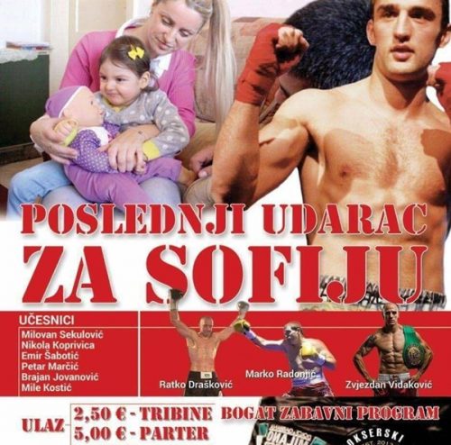 Navodi se da će sav prihod od prodatih ulaznica biti namijenjen za liječenje oboljele djevojčice Sofije Šušić u Turskoj i Novom Sadu. Glavna borba večeri u Sportskom centru u Nikšiću biće meč između Boška Draškovića i Džemala Bošnjaka.