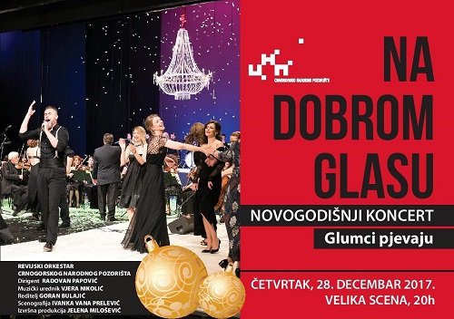 U četvrtak 28. decembra na Velikoj sceni Crnogorskog narodnog pozorišta u 20 sati biće održan muzičko-scenski spektakl pod nazivom „Na dobrom glasu“. Uz pratnju revijskog orkestra CNP-a pod dirigentskom palicom Radovana Papovića, crnogorski glumci će izvoditi popularne pop, rok i džez melodije.
