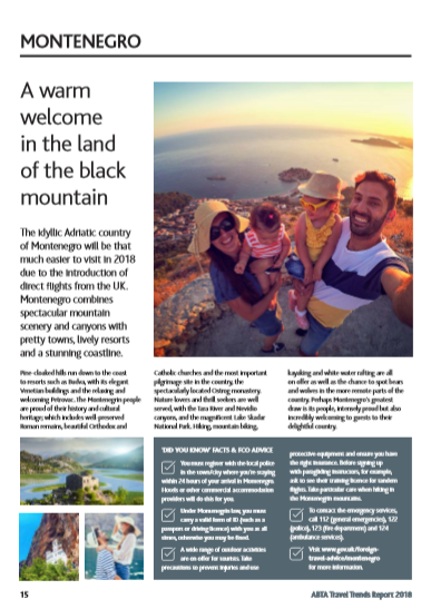 Najveće britansko udruženje turističkih agencija i turoperatora ABTA uvrstilo je Crnu Goru u svoj godišnji Izvještaj o trendovima u putovanjima za 2018. godinu (ABTA's 2018 Travel Trends Report). Crna Gora se navodi kao jedna od 12 destinacija koje zaslužuju pažnju i koje će biti promovisane kroz njihove kanale promocije u 2018. godini.