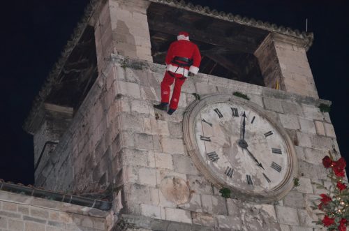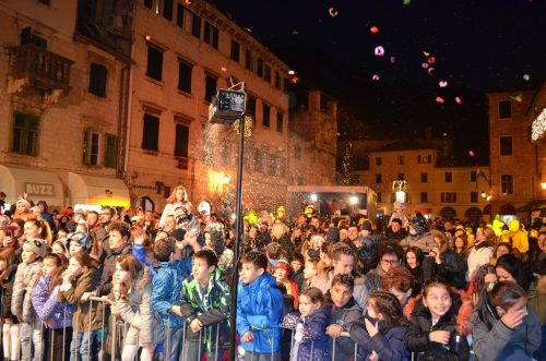 Prethodno su Djeda Mraz i Vilenjak napravili đir po kotorskim naseljima, i putem razglasa pozivali mališane i odrasle na doček i super zabavu u 16 časova na glavnom gradskom trgu – Trg od Oružja. Spustivši se sa “Sat kule”, Djeda Mraz je podijelio paketiće svim posjetiocima, a mališani, horovi, glumci nastavili su razigranu zabavu.