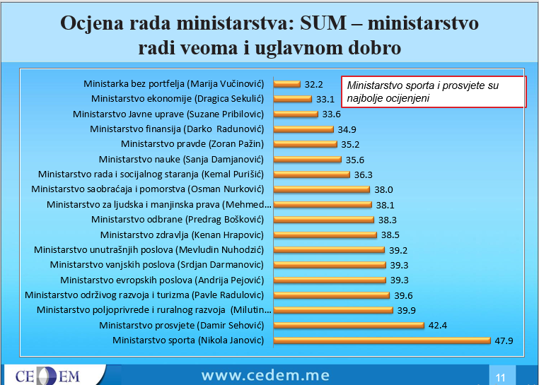 Izvršna direktorica CEDEM-a Milena Bešić istakla je da, kada je u pitanju ocjena rada ministarstva, ministarstva sporta i prosvjete su najbolje ocijenjena.