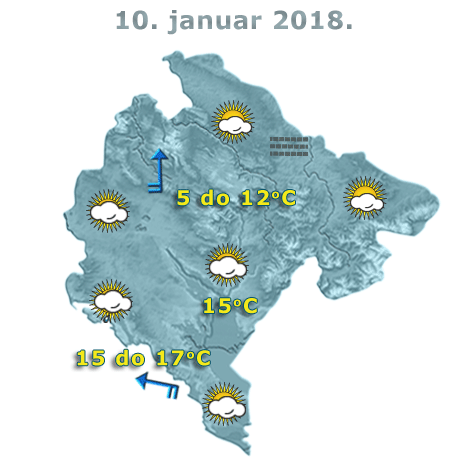 U Crnoj Gori danas će biti promjenljivo do pretežno oblačno i uglavnom suvo. Jutarnja temperatura nula do 11 stepeni, najviša dnevna od pet do 17 stepeni.