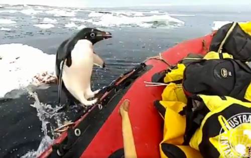 Australijsko antarktičko odjeljenje je danas na Twitteru objavio video uz opis “Kad se pingvin pojavi kako bi provjerio kako ti ide posao”. Radi se o tome da je jedan pingvin prilično brzo iskočio iz vode i našao se na njihovom istraživačkom čamcu. Pingvin je doskočio na noge, ali se malo poklizao i zabio u stvari na čamcu.