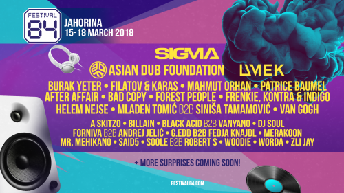 Furioznu listu Festivala 84 predvode britanske superzvijezde Sigma, poznati po hitovima koji ne silaze sa radio stanica i saradnji sa zvijezdama kao što su Kanye West, Ellie Goulding i Paloma Faith, dok oni sami predvode programe najvećih zimskih festivala zbog borderske himne ,,Higher” koju pjeva Labrinth. Na Jahorinu stiže i čuveni aktivistički kolektiv i velika londonska grupa Asian Dub Foundation, čiji je zvuk bio direktni uzor najvećoj balkanskoj grupi Dubioza kolektiv. Uz njih dolaze i apsolutni klupski hitmejkeri Mahmut Orhan, Burak Yeter, te ruski DJ duo Filatov & Karas čiji hitovi broje milijardu YouTube pregleda. Za prave techno i house maratone na planini biće zadužena lista koju predvodi slovenački ,,techno otac” Umek, te proslavljeni holandski DJ mag Patrice Bäumel, ali i najtiražniji techno duo na Balkanu, banjalučki tandem Mladen Tomić i Siniša Tamamović. Regionalne rok superzvijezde Van Gogh dolaze na Jahorinu da okupe publiku iz svih krajeva, a žestoko će biti i uz neprikosnovene regionalne repere kao što su Bad Copy, te Frenkie, Kontra i Indigo, ali i trenutno najslušaniji mangupi Helem nejse. Na Festival 84 dolaze i najbolji predstavnici domaće muzičke scene, After Affair, A Skitzo, Billain, Black Acid b2b Vanyano, DJ Soul, Forest People, Forniva b2b Andrej Jelić, G.Edd b2b Fedja Knajdl, Merakoon, Mr. Mehikano, Said5, Soole b2b Robert S, Woodie, Worda, Zli Jay i mnogi drugi!