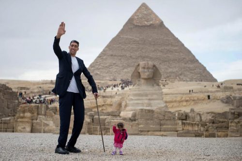 Kosen, visok nevjerovatnih 251 centimetar ispred piramida u Gizi stao je pokraj Amge, koja mjeri tek 60 centimetara pa su snimili zajedničku fotografiju. U Egipat su došli na poziv egipatskog odbora za promociju turizma i učestvovali na konferenciji u Kairu.