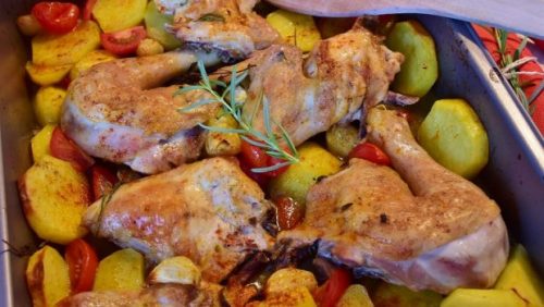 Batake i karabatake dobro posuti solju i biberom, pa poređati preko krompira. Na svaki staviti kockicu maslaca ili malo masti. Tepsiju umotati u alufoliju i peći oko 30 minuta, a zatim otvoriti foliju i zapeći otvoreno još malo dok ne porumeni.