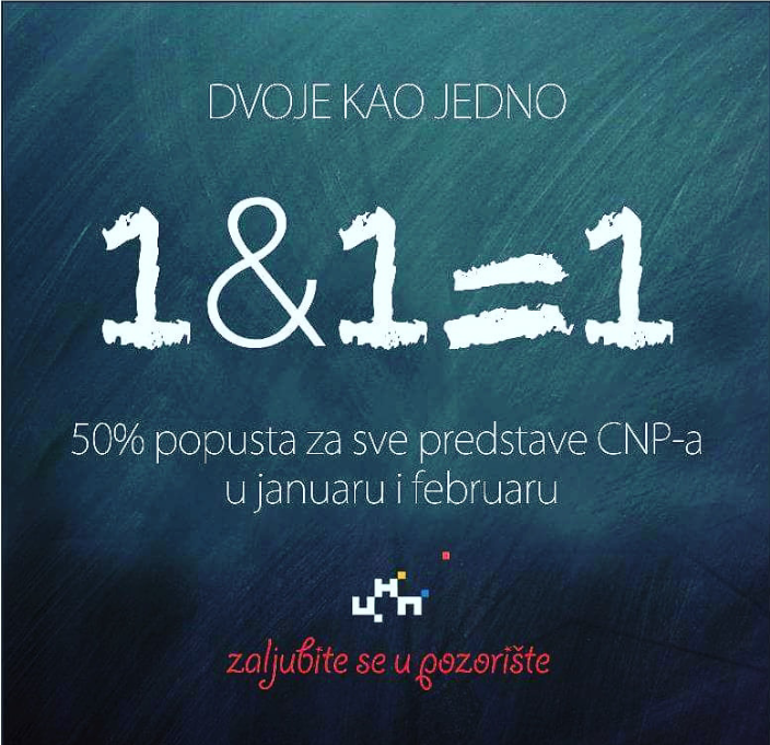 Februar u Crnogorskom narodnom pozorištu obilježava nastavak akcije ,,Dvoje kao jedno – zaljubite se u pozorište”. Akcija omogućava 50% popusta na ulaznice za sve programe u produkciji CNP-a.