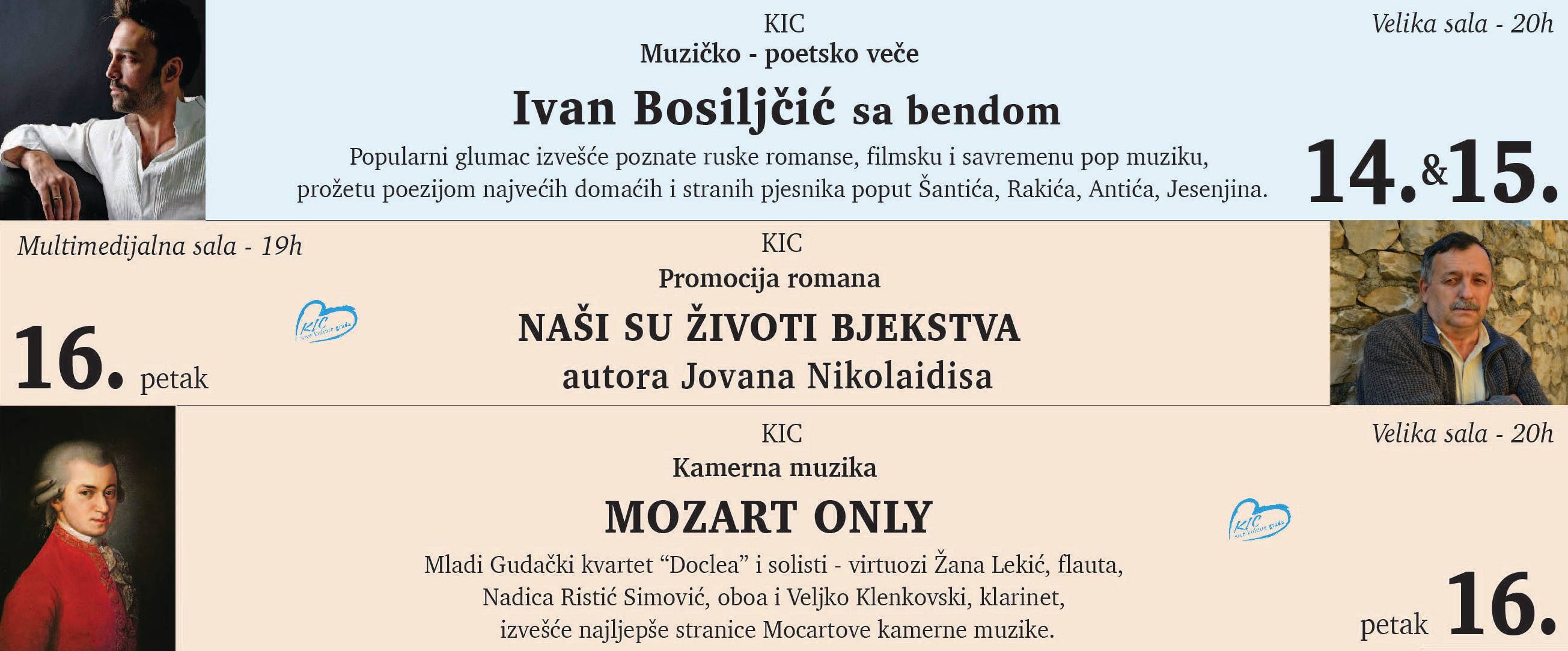 Za Dan zaljubljenih KIC je odlučio da crnogorskoj publici podari veče muzike i poezije Ivana Bosiljčića sa bendom. Veče će biti priređeno 14. i 15. februara od 20 sati u Velikoj sali. Ulaznice za muzičko – poetske večeri Ivana Bosiljčića po cijeni od 10 eura mogu se kupiti na KIC-biletrarnici (9 – 20h) od sjutra – 1. februara.