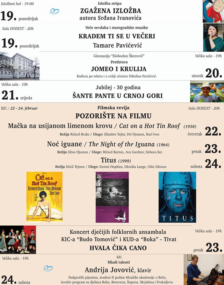 Kroz ciklus ,,Pozorište na filmu III”, ističu iz KIC-a, nastaviće uspješnu saradnju dramskog i filmskog programa KIC-a, pa će od 22. do 24. februara prikazati filmove čija tema je upravo odnos pozorišta i kinematografije: 22. februar – ,,Mačka na usijanom limenom krovu” (1958), 23. februar – ,,Noći iguane” (1964) i 24. februar – ,,Titus” (1999).