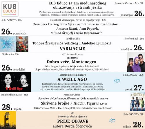 – I ove godine nastavljamo sa promovisanjem udruživanja i umrežavanja i sa srodnim institucijama, ali i sa ambasadama i inostranim kulturnim centrima, NVO-ima, kreativnim pojedincima i grupama, a prijatelji naših februarskih programa su: Japanski ugao, JICA Alumni Montenegro, Udruženje likovnih umjetničkih stvaralaca Crne Gore, Centar za očuvanje i razvoj kulture manjina, Gimnazija ,,Slobodan Škerović”, Američki ugao, NVO Studentski teatar, GlobalSoft Montenegro, i drugi. Naši programski sadržaji sa zadovoljstvom ističemo bili su izuzetno posjećeni i tokom decembra i januara, pa je oko 8 i po hiljada posjetilaca uživalo u brojnim koncertnim, filmskim, dramskim, književnim i likovnim programima – ističu iz KIC-a.