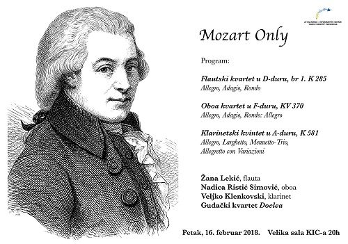 U okviru koncernog ciklusa ,,Kamerna muzika” KIC ,,Budo Tomović” organizuje koncert posvećen muzici Volfganga Amadeusa Mocarta pod nazivom ,,Mozart Only”, u petak, 16. februara, u Velikoj sali sa početkom u 20 sati. Ulaz je besplatan.