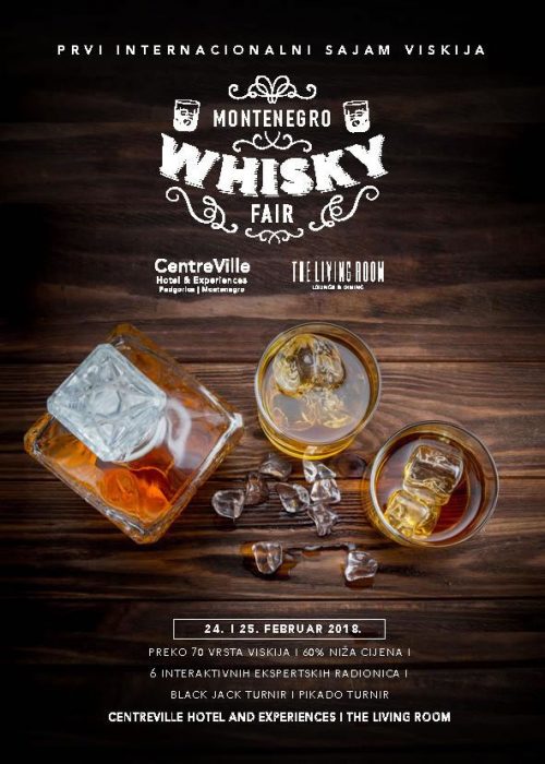 Prvi sajam viskija u Crnoj Gori „Whisky Fair“ biće organizovan u subotu i nedjelju, 24. i 25. februara u hotelu CentreVille. Na sajmu će biti predstavljeno više od 100 vrsta viskija iz Škotske, Irske, Sjedinjenih Država, Češke, Japana, Indije i Tajvana.