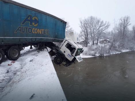 Kabina kamiona i dio kamiona visili su iznad Velike Morave, a vozač je satima bio zarobljen u kabini.