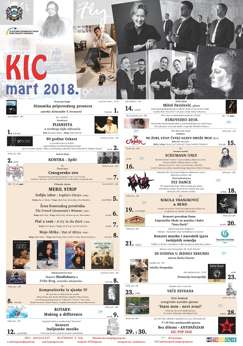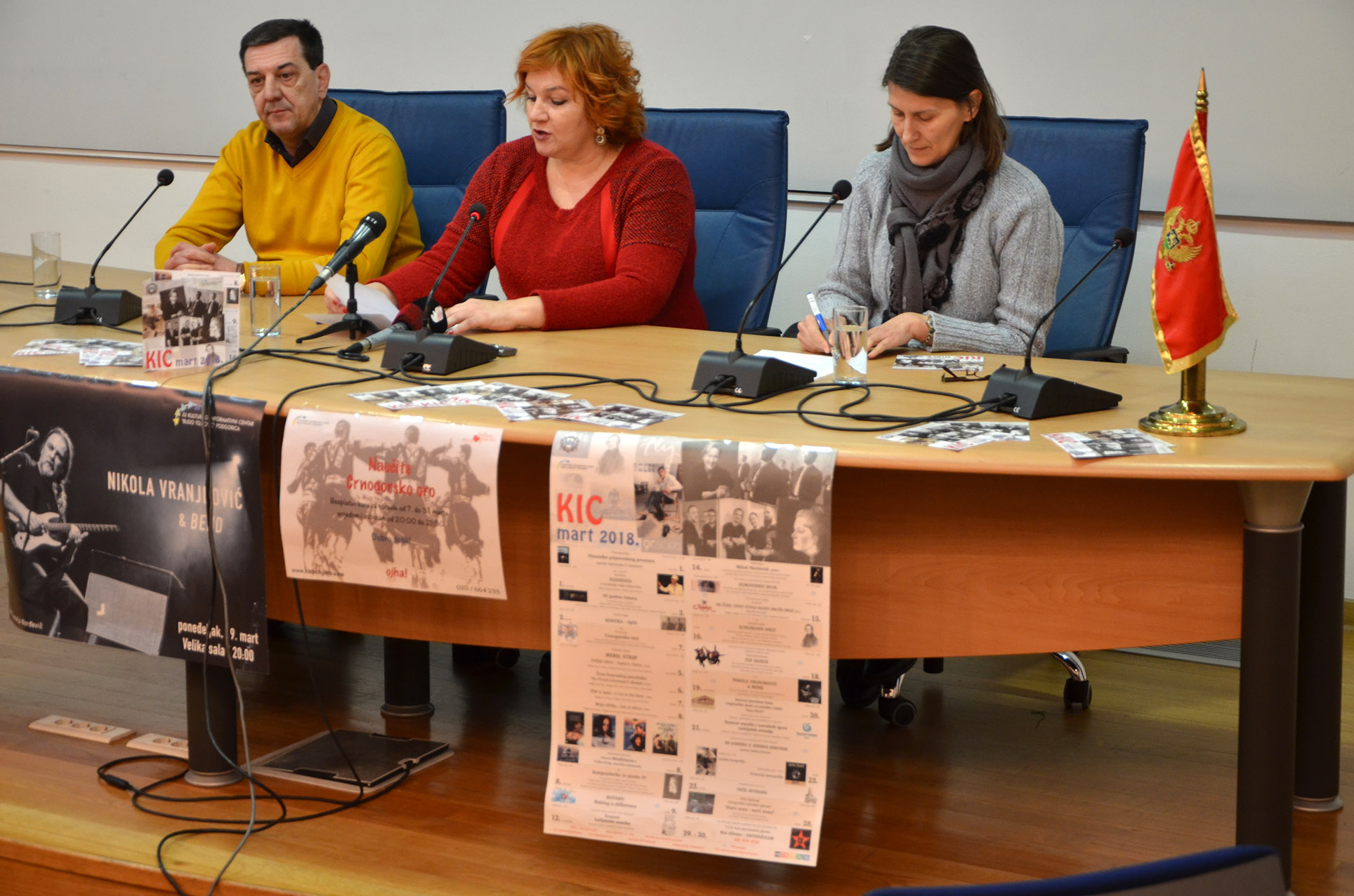 – Sa podgoričkim umjetnicima bićemo domaćini Prvog festivala crnogorske narodne pjesme ,,Stare note – novi zvuci” i to 28. marta, a oko 20 mladih interpretatora izvešće poznate narodne pjesme. Za građane Podgorice i sve zainteresovane od 7. do 31. marta organizovaćemo četvrti besplatan kurs „Crnogorsko oro“. U saradnji sa brojnim partnerima i ambasadom SAD, omogućićemo publici da upozna grupu Fly Dance koja će plesni spektakl pun zabave i mladalačke energije prirediti 18. marta na velikoj sceni. U melodijama i folklornim igrama članova udruženja iz Ankare uživaćemo 21. marta, a veče sevdaha biće održano 23. marta – najavljuju iz KIC-a.
