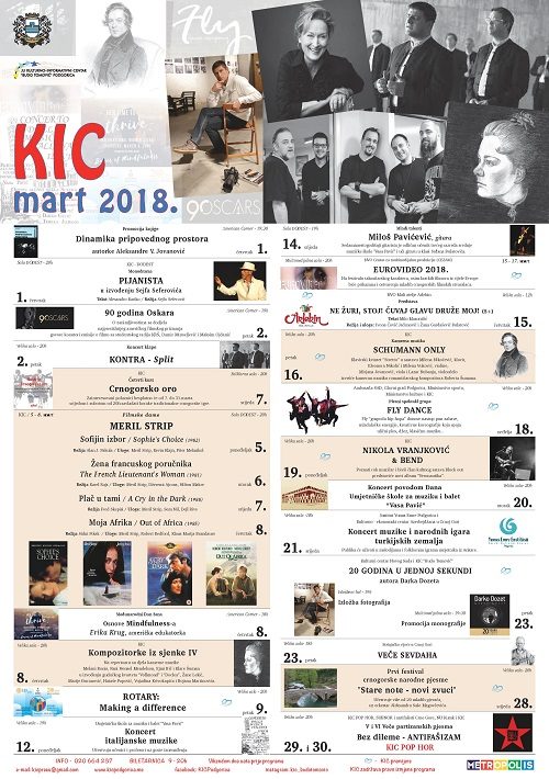 Većina KIC programa i u martu je besplatna. Ulaznice za koncert Nikole Vranjkovića i benda po cijeni od 10 eura mogu se kupiti na KIC-biletrarnici (9 – 20h) od 1. marta. Besplatne ulaznice za koncert klape Kontra, možete od danas (27. februar) podići na biletarnici.