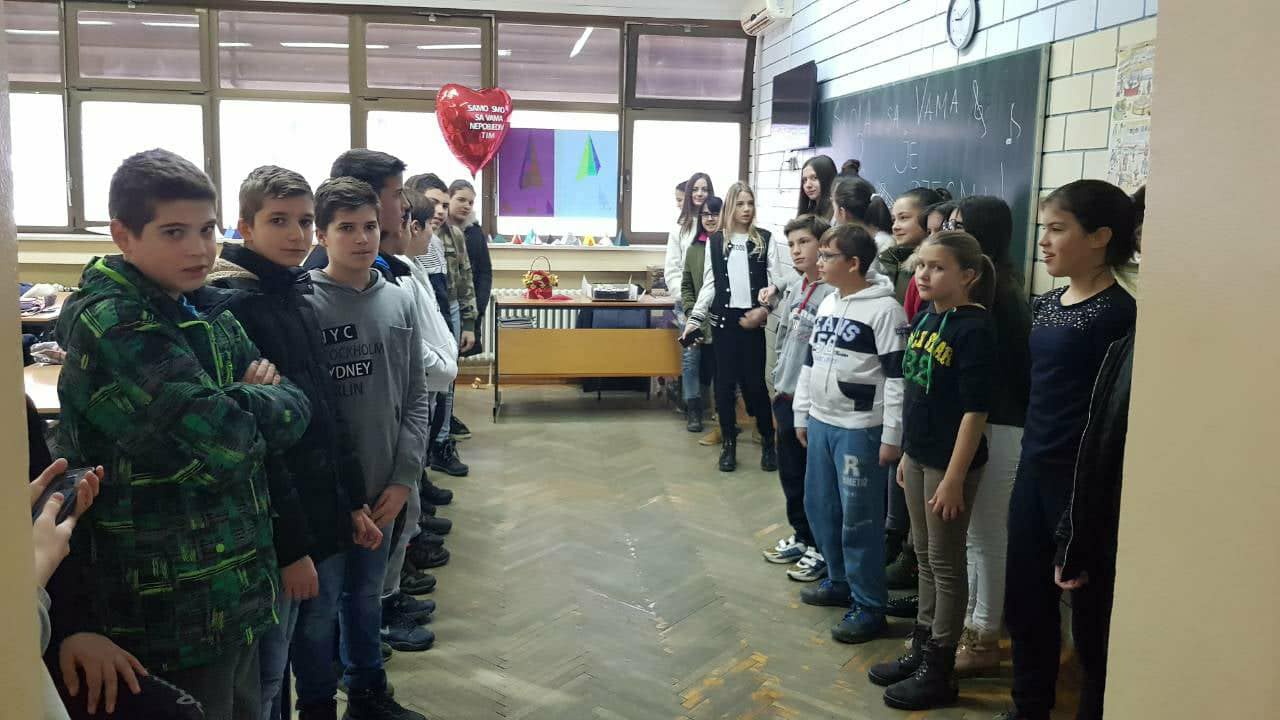 Učenici sedmog razreda OŠ ,,Pavle Rovinski” u Podgorici su razrednu poslije dugog odsustva dočekali uz pjesmu: ,,Kako je dobro vidjeti Vas opet…..!”