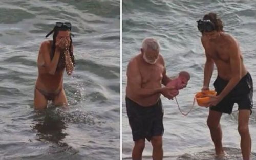Nekoliko trenutaka kasnije, iz mora je izašla i mama novorođene bebe i pridružila se ostatku porodice na plaži, gdje je bilo još jedno, nešto starije dijete.
