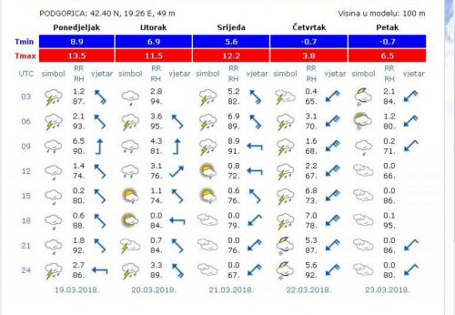 -Umjereno do potpuno oblačno, povremeno kiša ili pljusak sa grmljavinom, a u višim planinskim predjelima na sjeveru, kiša će prelaziti u susnježicu i snijeg. Krajem dana i tokom noći u većem dijelu sjevernih, ponegdje i u višim planinskim oblastima centralne regije, kiša će preći u susnježicu i snijeg. Intenzivnije padavine tokom noći. Vjetar povremeno umjeren do jak, južnih smjerova. Jutarnja temperatura vazduha -3 do 9, najviša dnevna 1 do 13 stepeni- kaže se u saopštenju Zavoda za hidrometerologiju i seizmologiju.