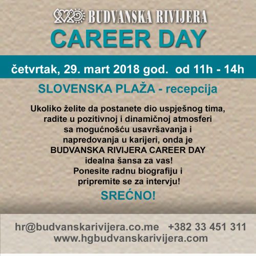 Hotelska grupa Budvanska rivijera, u četvrtak 29. marta sa početkom u 11 sati, organizuje Career Day za sve zainteresovane koji žele naći zaposlenje u najvećem turističko ugostiteljskom preduzeću u Crnoj Gori.