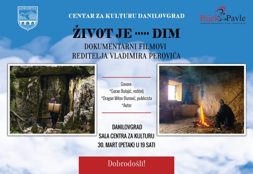 Revija dokumentarnih filmova reditelja Vladimira Perovića biće upriličena u sali Centra za kulturu Danilovgrad 30. mart s početkom u 19 sati. Organizator događaja je Centar za kulturu Danilovgrad i KIC Bijeli Pavle.