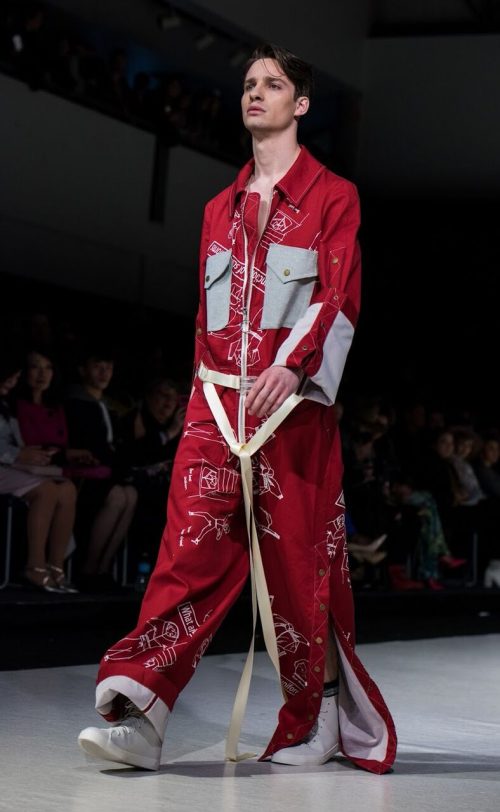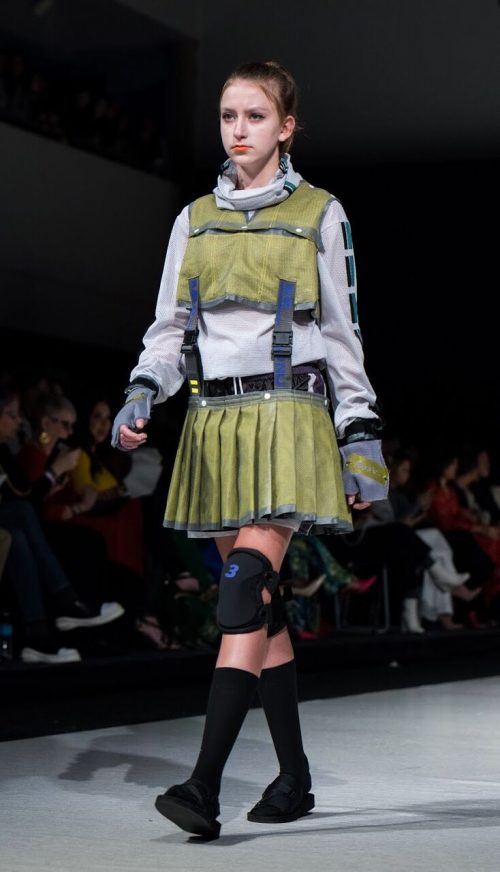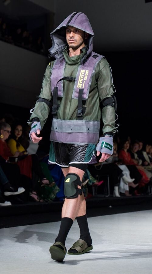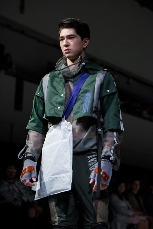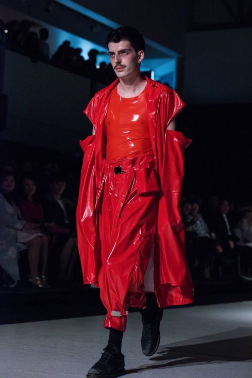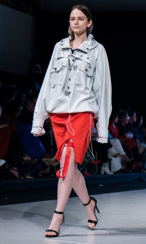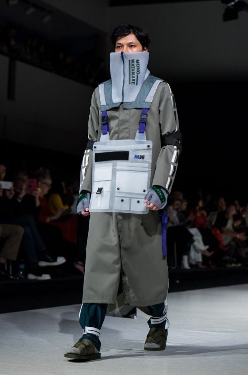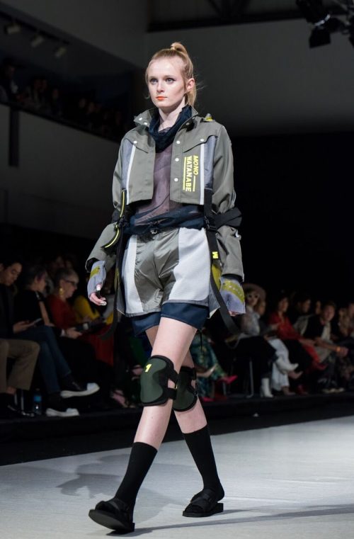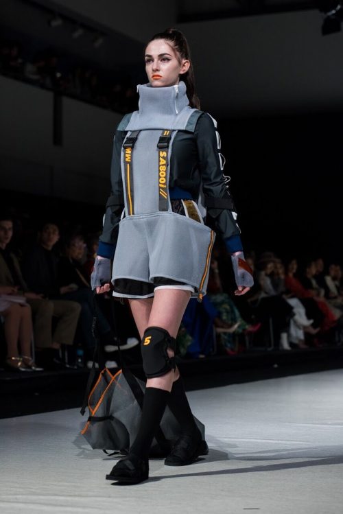 Marronier College of Fashion Design from Japan presented two emerging designers Mono Watanabe and Rinka Hyodo. Mono Watanabe took us into the future with technical fabrics and fastenings. Greys were placed with accents of green, orange, and purple in layered pieces. Matching knee pads and high zip up neck pieces brought the collection together.