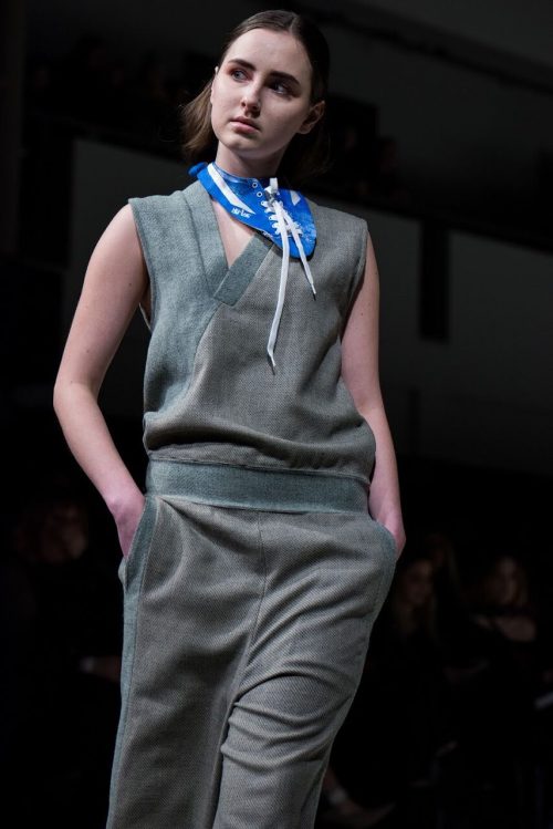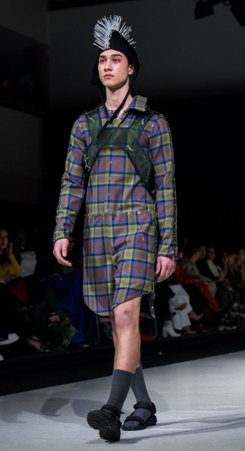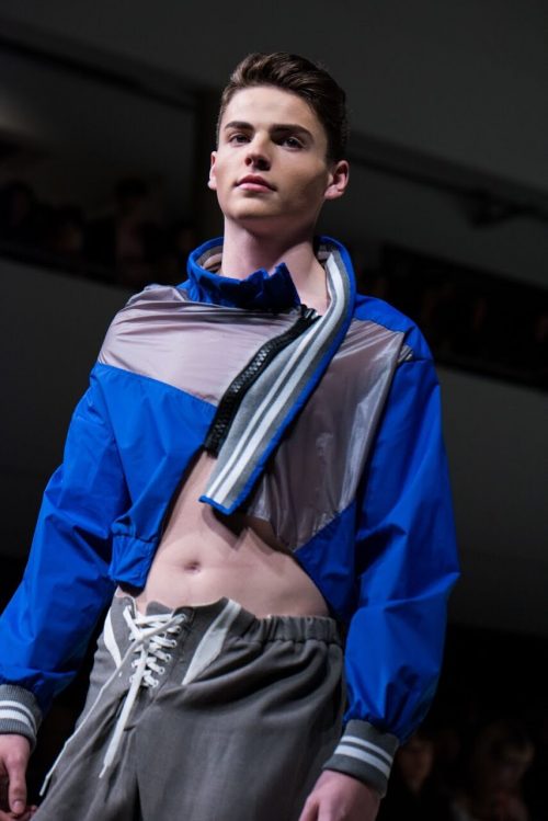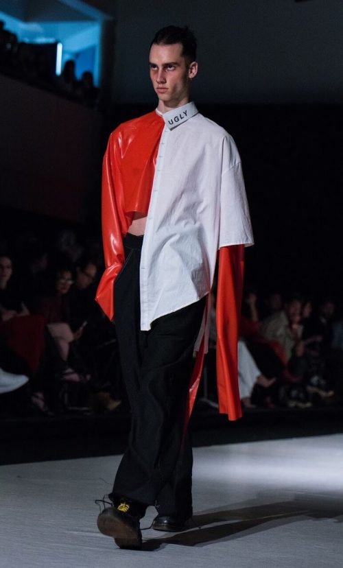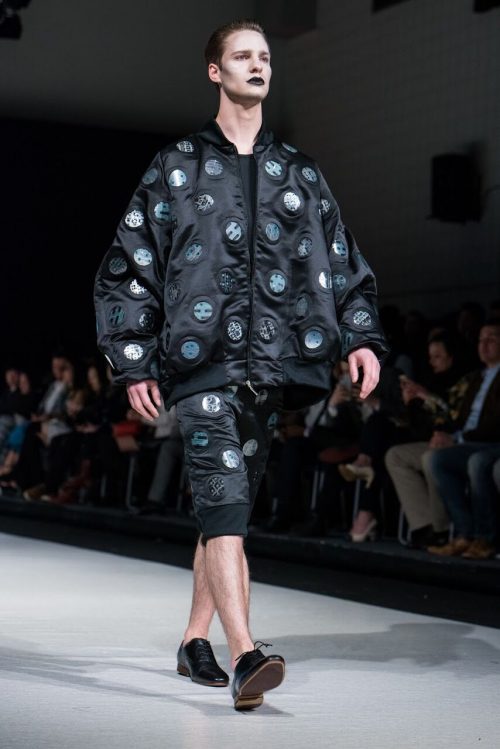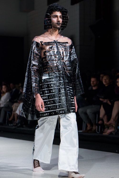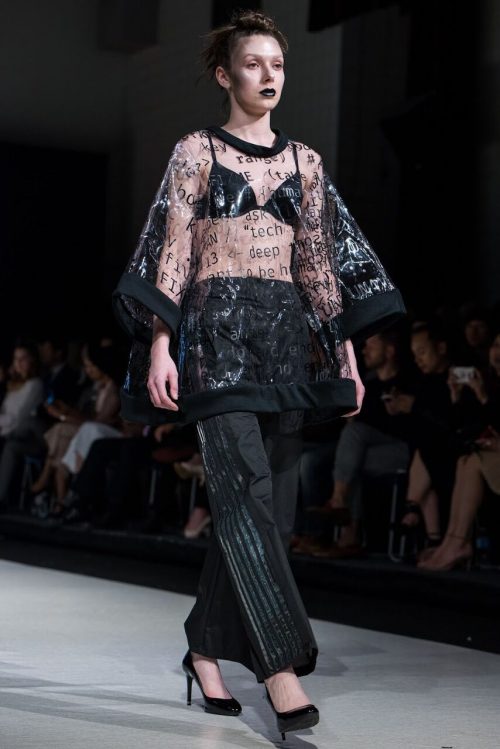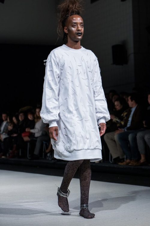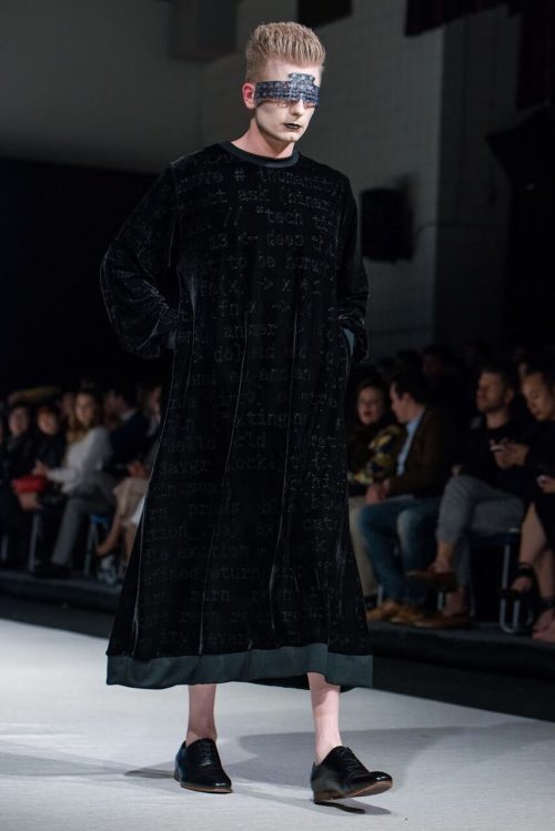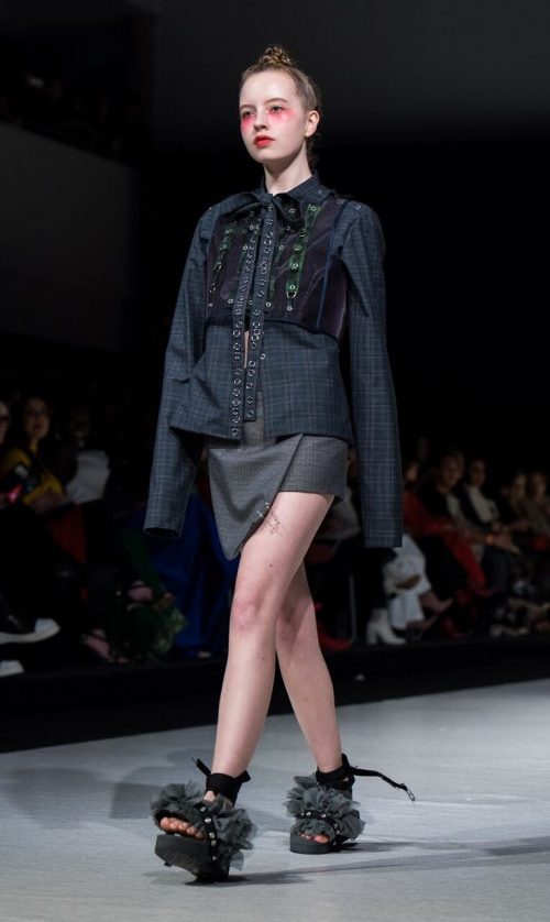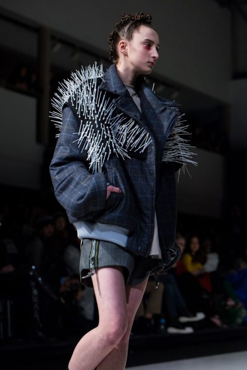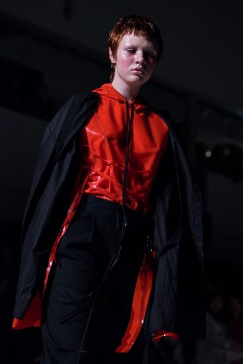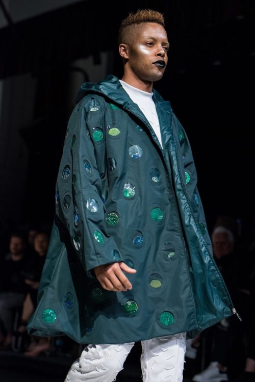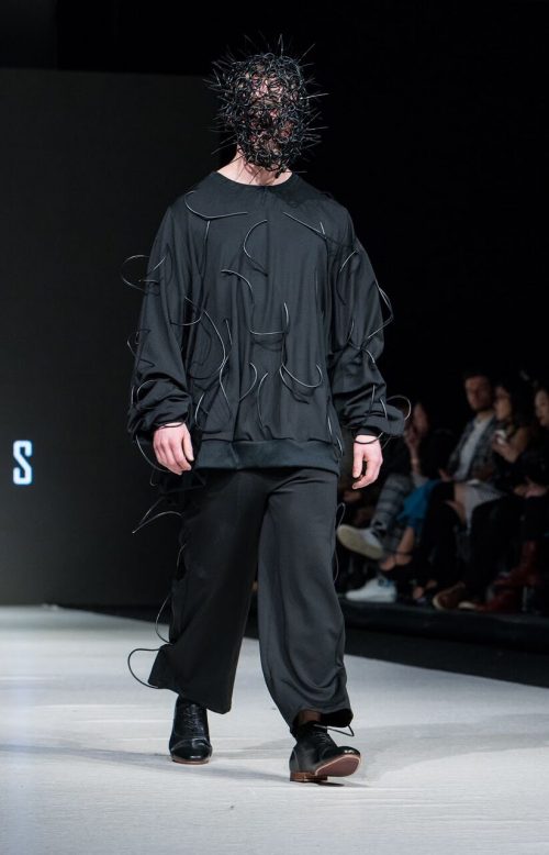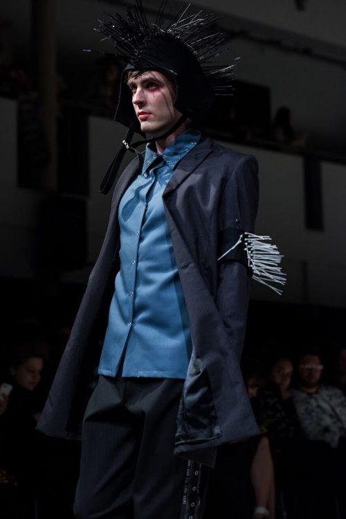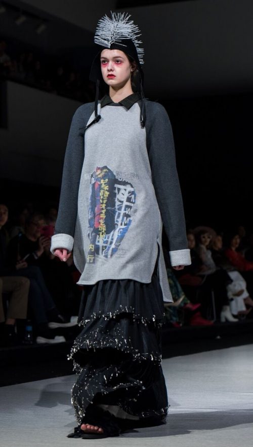 Rinka Hyodo’s unisex collection pushed an eclectic individual style. An oversized grey sweater was worn over a full length tiered skirt with sparkled edging. Silver eyelets added detail, whilst a textured hood covered in spikes created a unique look.