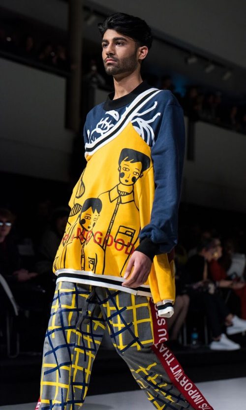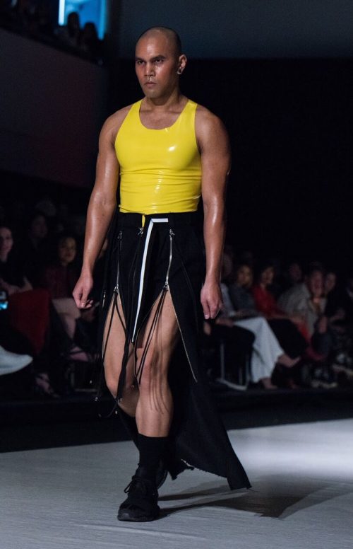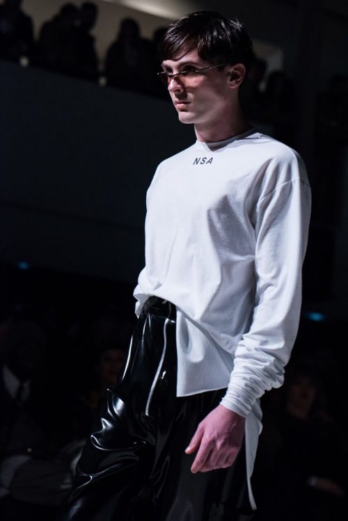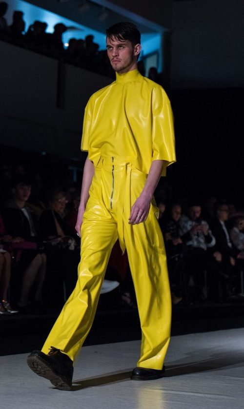 NOT DEAD YET, an experimental menswear label from Vancouver explored identity and sexuality in the collection SHAME. Models walked with attitude wearing latex in black, vibrant yellow, and acid green with white text ,,pics?” and ,,loading” emblazoned across garments.
