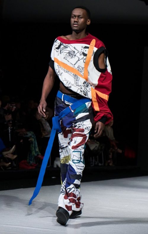 Next, designer Nadrey Laurent from Ghana showcased a sleek line of figure-flattering dresses with a clerical inspiration. An extensive use of black and white was a nod to the Catholic nun Louise, the Black Nun of Moret, with prints of her character adorning the fronts of looks. A black full-length dress with gold floral detail and high ruffled neckline stole the show.