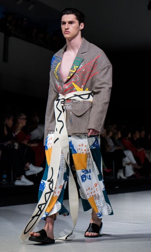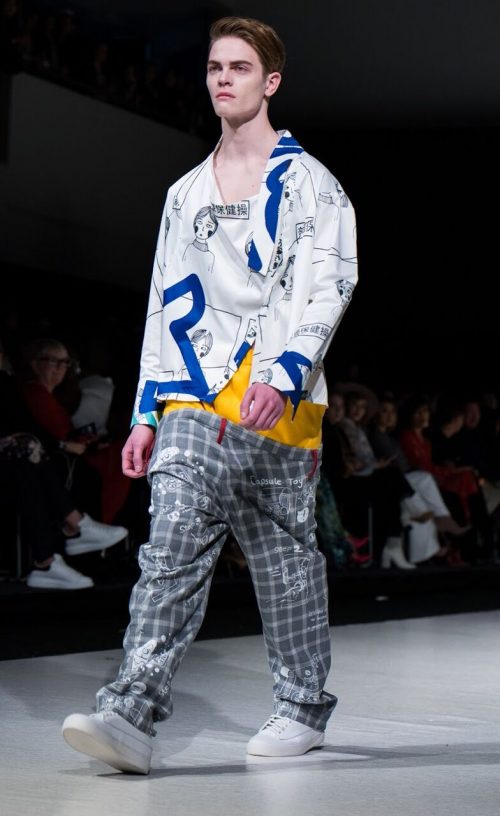 A duo show meshed the work of US based brands Yuner Shaox Zherui Huang seamlessly together. Yuner Shao’s creations act as a canvas to carry anti-propaganda messages fusing graphic prints in primary colours. Bright yellow patch pockets and loose belts enhanced the youthful vibe. Zherui Huang’s casual unisex collection had a focus on technical details. Zips, buckles, and laces infuse a sports aesthetic into loose silhouettes with asymmetric shaping. Men’s bold blue wide leg pants featured hanging straps and contrast yellow detail for a modern, fresh look.