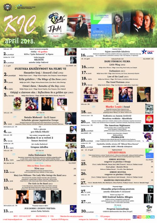 Tradicionalno u aprilu KIC-ove programe obilježavaju najviše muzički sadržaji sa prepoznatljivom i popularnom manifestacijom Mjesec poštovanja džeza u Crnoj Gori, koju će 3. aprila otvoriti u Velikoj sali koncert poznate bosanske vokalne umjetnice Nataše Mirković pod naslovom ,,En El Amor: Sefardske pjesme jugoistočne Evrope”, a uz podršku renomiranih umjetnika francuskog soliste na serpentu Mišela Godara (Michel Godard) i američkog bubnjara i perkusioniste Džaroda Kejdžvina (Jarrod Cagwin). U srijedu 11. aprila premijerno na sceni KIC-a nastupa njemački Julija Hulsman trio, a KIC je domaćin i ciklusa ,,Džez na filmu: Žene u džezu” 12. i 13. aprila.