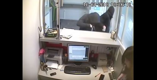 Na snimku se vidi kako su dvojica pljačkaša, uz prijetnju pištoljem, od zaposlene iznudili nepoznatu svotu novca.