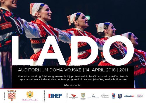 U subotu, 14.aprila u 20h u renoviranom Atrijumu Doma Vojske – Uprave zgrade Porto Montenegra na Seljanovu,biće organizovan vokalno – instrumentalni koncert hrvatskog ansambla LADO. 60 umjetnika će na koncertu izvesti neke od najpoznatijih narodnih pjesama kao što su ,,Dobar večer dobri ljudi” u obradi Bože Potočnika, ,,Grad se beli” u obradi Zlatka Potočnika, ,,Ladarke” autora Emila Cossetta, te četiri muzičke teme iz Boke Kotorske, standardne postave koreografije ,,Kolovođo, diko naša” , a u obradi Marijana Makara.