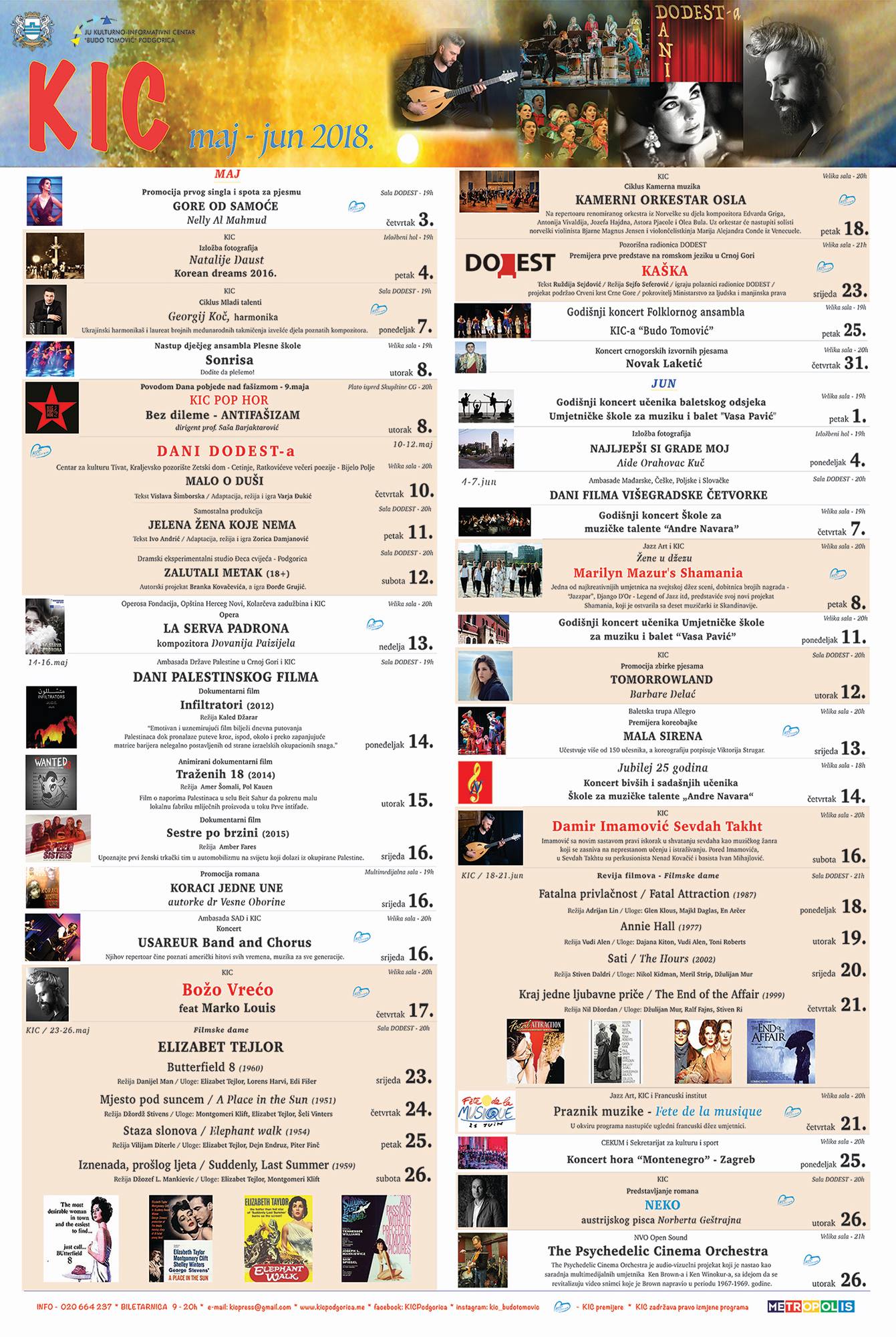 Opera ,,Služavka gospodarica” (La serva padrona) kompozitora Đovanija Paizijela biće izvedena 13. maja u saradnji sa produkcijom Operosa, a svoj prvi singl i spot za pjesmu ,,Gore od samoće” 3. maja predstaviće podgoričkoj publici sugrađanka Nelly Al Mahmud. Godišnji koncert Folklornog ansambla KIC-a „Budo Tomović“ biće održan 25.maja, dječiji ansambl Plesne škole Sonrisa nastupiće 8. maja, dok će koncert crnogorskih izvornih pjesama Novaka Laketića biti organizovan 28. maja.