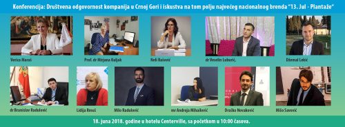 Institut za društveno odgovorno poslovanje Crne Gore u saradnji sa kompanijom „13. Jul Plantaže“ organizovaće 18. juna u hotelu CentreVille konferenciju pod nazivom ,,Društvena odgovornost kompanija u Crnoj Gori i iskustva na istom polju najvećeg nacionalnog brenda 13. Jul – Plantaže”, koja će se održati
