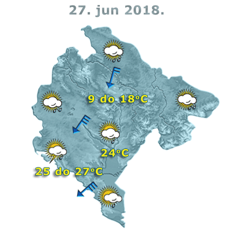 Umjereno do potpuno oblačno, povremeno kiša, ponegdje i kratkotrajni pljuskovi, češće u sjevernim predjelima. Vjetar povremeno umjeren do jak, sjevernih smjerova. Najviša dnevna temperatura vazduha 9 do 27 stepeni, saopšteno je iz Zavoda za hidrometeorologiju.