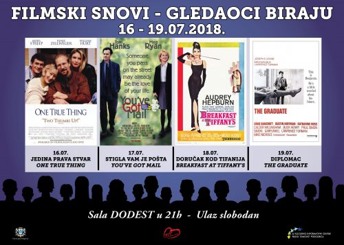Treće izdanje revije „Filmski snovi – gledaoci biraju“ organizovaćemo u okviru filmskog programa Kulturno – informativnog centra „Budo Tomović“ od 16. do 19. jula u sali DODEST, sa početkom u 21 sat. Ulaz je besplatan.