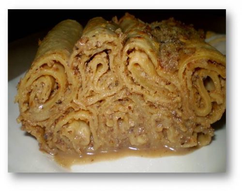 Palačinke urolati, pa jedan red staviti u keramičku, vatrostalnu ili neku drugu dublju posudu za pečenje. Presuti ih sa po tri kašike šećera i oraha. Potom staviti drugi red palačinki, posuti ih orasima i šećerom, pa staviti treći red palačinki. I njih posuti orasima i šećerom.